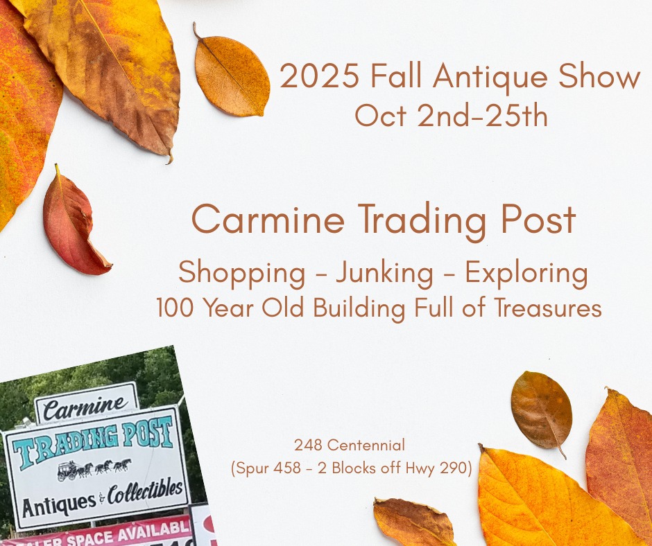 Website https://www.facebook.com/CarmineTradingPost Location Carmine Traading Post 248 Centennial St Carmine, TX 78932 Phone: 979-278-4040 Web site: https://www.facebook.com/CarmineTradingPost You won't believe what you will find in our 100 year old building full of treasures - antiques, vintage clothes & jewelry, quilts, glassware (Corningware, Fire King, Anchor Hocking), and much, much more! Shop Burton, Carmine, Round Top, Warrenton, Fayetteville & LaGrange while int he area. Get Directions using Google MapsECA218B8-5E11-4441-94EA-EDBD14B9C4C0