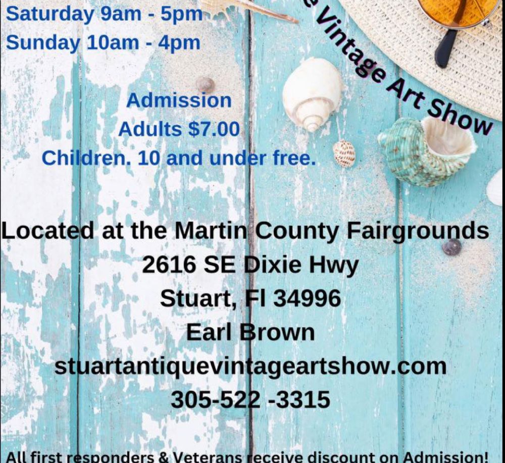 Website StuartAntiqueVintageArtShow.AntiqueTrail.com Location Martin County Fairground 2616 SE Dixie Hwy (A1A) Stuart, FL 34996 Contact Name: Earl Brown Phone: 305-522-3315 Web site: StuartAntiqueVintageArtShow.AntiqueTrail.com ![]() Saturday 9am - 5pm Get Directions using Google MapsSend Email to Event Contact7C9456C5-3A89-47E2-8CBD-657316B93F49