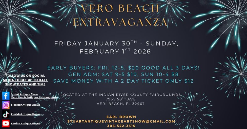 Website VeroBeachExtravaganza.AntiqueTrail.com Location The Indian River Fairgrounds 7955 58th Ave Vero Beach, FL 32967 Contact Name: Earl Brown Phone: 305-522-3315 Web site: VeroBeachExtravaganza.AntiqueTrail.com EARLY BUYERS: FRI. 12-5, $20 GOOD ALL 3 DAYS! Get Directions using Google Maps40EC3CC6-7B63-435F-B3D8-AE80AD32F302