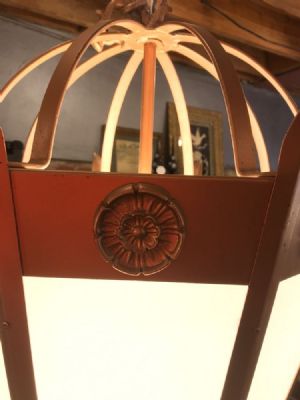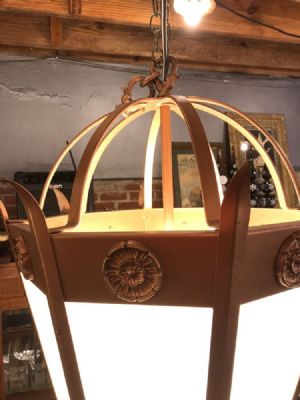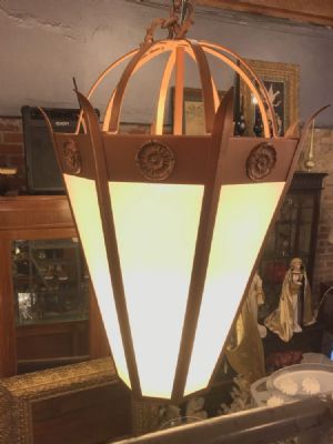 1960's Gothic style Church chandelier. Can be used for residential or commercial application. Aluminum frame in medium gold patina, diffuser acrylic panels. Variety of lighting options with 9 bulbs that provide light from upper and lower along with diffused light. Seen here with LED bulbs for energy savings. One of four identical chandeliers. Each $1740.00 or all four for $6000.00. Chandeliers approximately 38" tall, width is approximately 25".
