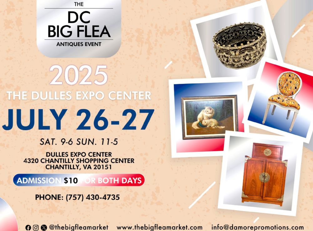Website TheBigFleaMarket.com Location Dulles Expo Center 4320 Chantilly Shopping Center Chantilly, VA 20151 Contact Name: Marthia Sides Phone: 7574304735 Web site: TheBigFleaMarket.com Saturday 9am-6pm Sunday 11am-5pm Antique and Collectible Flea Market Get Directions using Google MapsSend Email to Event Contact9934AF05-F0AE-4B46-9F19-67D94485A547