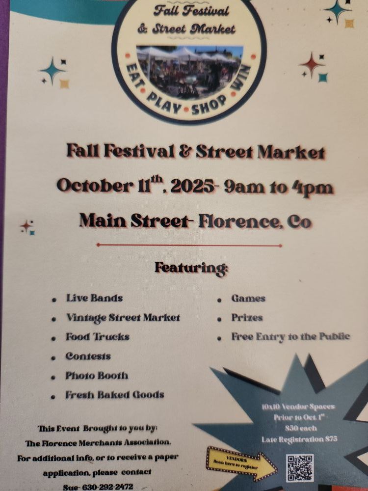 Location 103 Vintage Market 103 W Main St Florence, CO 81226 Contact Name: Sue Tierney Phone: 630-292-2472 ![]() Florence Fall Festival & Street Market October 11th 9am to 4pm Main St. Florence Colorado Live Bands Street Market Food Trucks Photo Booth Baked Goods Games Prizes Free Entry to Public