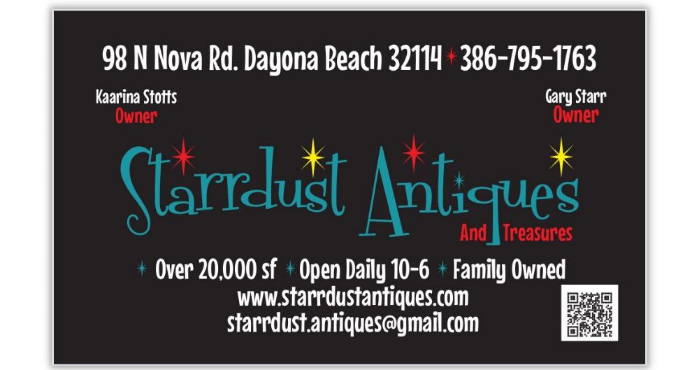 Website StarrDustAntiques.com Location Starrdust Antiques and Treasures 98 N Nova Rd Daytona Beach, FL 32114 Contact Name: Kaarina Stotts Phone: 386-795-1763 Web site: https://starrdustantiques.com/contact-us/ Stop by and visit our 20,000sf+ antique mall in Daytona Beach, FL, Nov 7th-9th for a storewide sale at Starrdust Antiques and Treasures in Daytona Beach, FL. Open daily 10-6 Address: 98 N Nova Rd, Daytona Beach, FL Get Directions using Google Maps009B6B6E-A8C9-42D4-93EC-BDA7AB5C0167