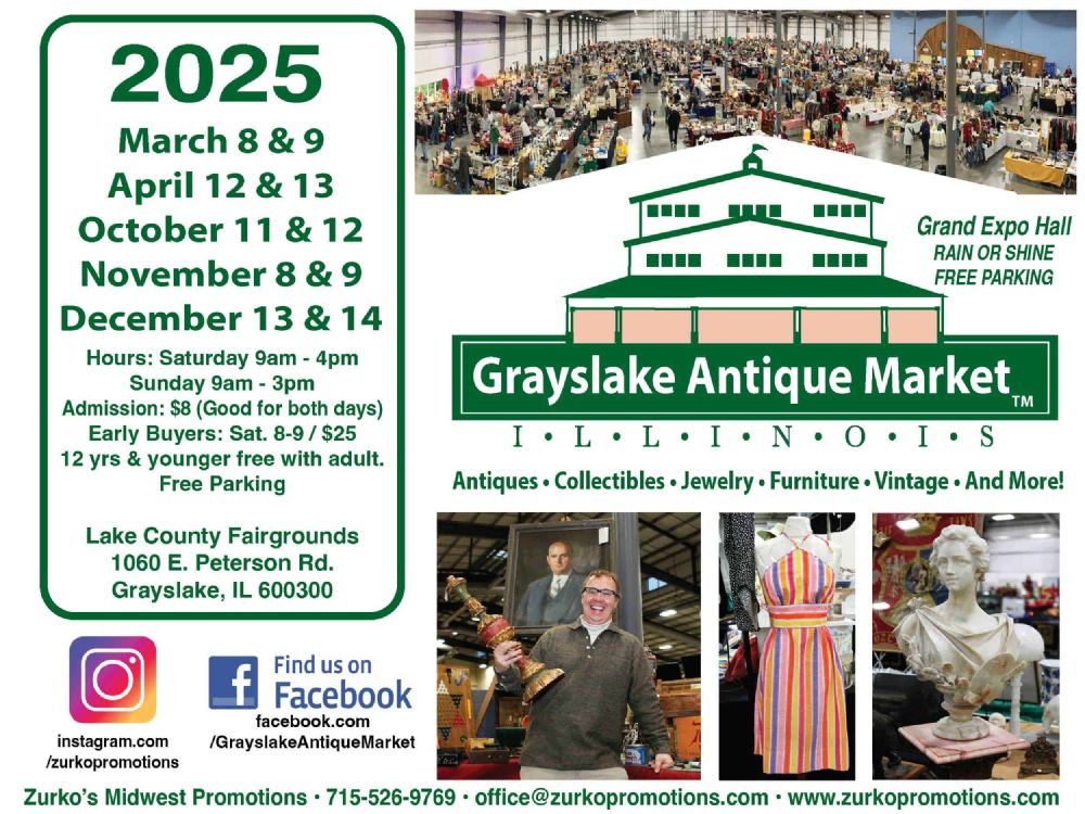 Website zurkopromotions.com/grayslake-chicago-illinois-antique-vintage-flea-market/ Location Lake County Fairgrounds 1060 E Peterson Rd. Grayslake, IL 60030 Contact Name: Tim or Bob Zurko Phone: 715-526-9769 Web site: https://zurkopromotions.com/grayslake-chicago-illinois-antique-vintage-flea-market/