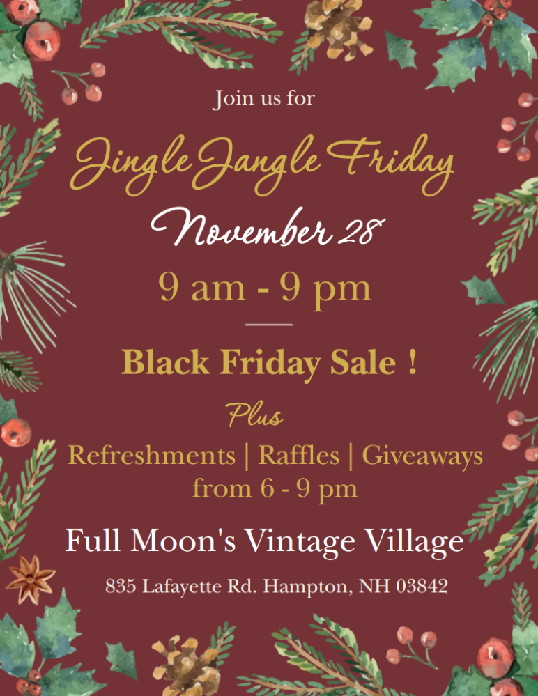 Website https://www.facebook.com/events/2858977070963412/?acontext=%7B%22event_action_history%22%3A[%7B%22mechanism%22%3A%22your_upcoming_events_unit%22%2C%22surface%22%3A%22bookmark%22%7D]%2C%22ref_notif_type%22%3Anull%7D Location Full Moon's Vintage Village 835 Lafayette Rd Hampton, NH 03842 Contact Name: Valerie Pace Phone: 6033953231 Shake off that Thanksgiving aftermath to find deals with our amazing 40+ vendors. Walk around, relax, and find that hidden gem someone will love ! Sales starting Friday 11/28 (Black Friday) through Christmas Eve. 10, 20 and 50% off on many treasures! Open extended hours on Black Friday (9am to 9pm). Get Directions using Google MapsSend Email to Event Contact4AA78AC5-C817-4DB5-8A26-BEC641D95E95