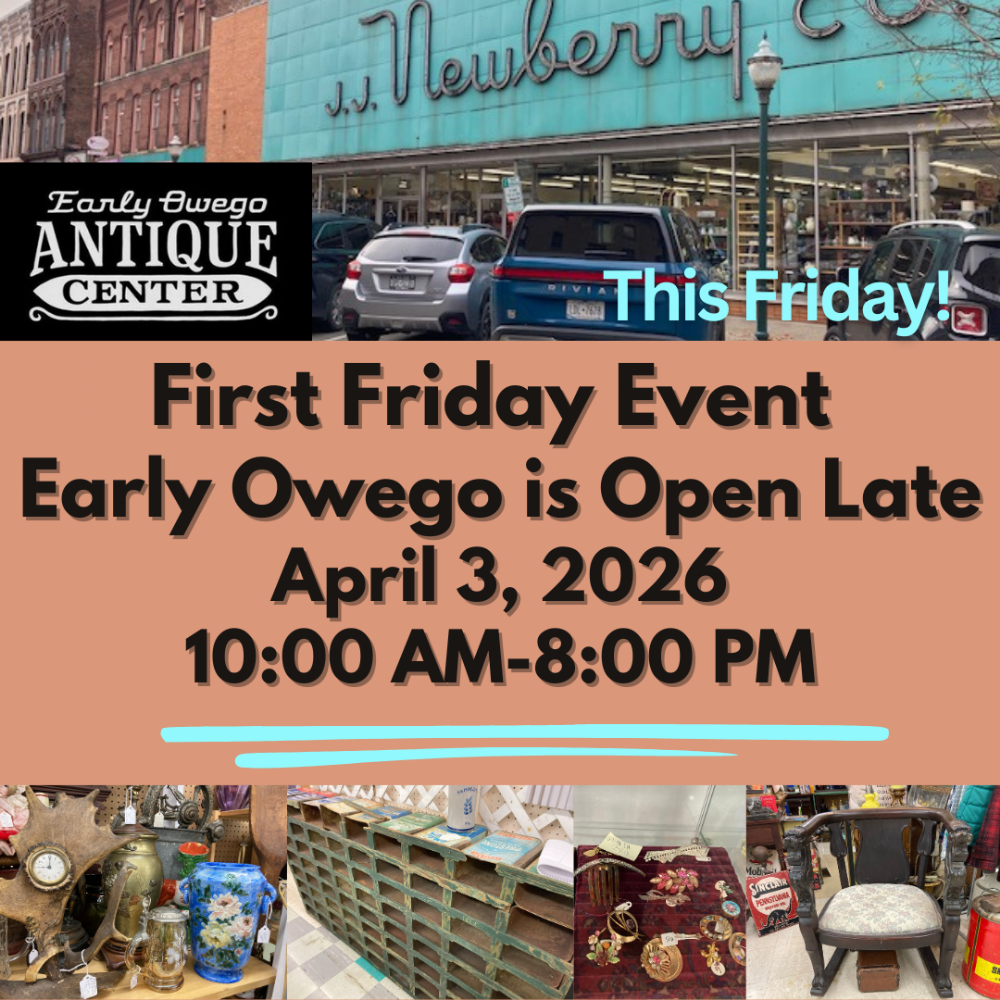 Website https://www.facebook.com/share/18cLczzLYu/ Location Early Owego Antique Center Corner of Lake and Main Street Owego, NY 13827 Contact Name: Layla Etienne Web site: https://www.facebook.com/share/18cLczzLYu/ Join us for the first First Friday of 2026! EOAC will be open late and have live piano playing from 5pm - 7pm by Thomas Hall. Get Directions using Google MapsSend Email to Event Contact46DE4F93-BEFC-4EAA-9E79-A71711A6AC04