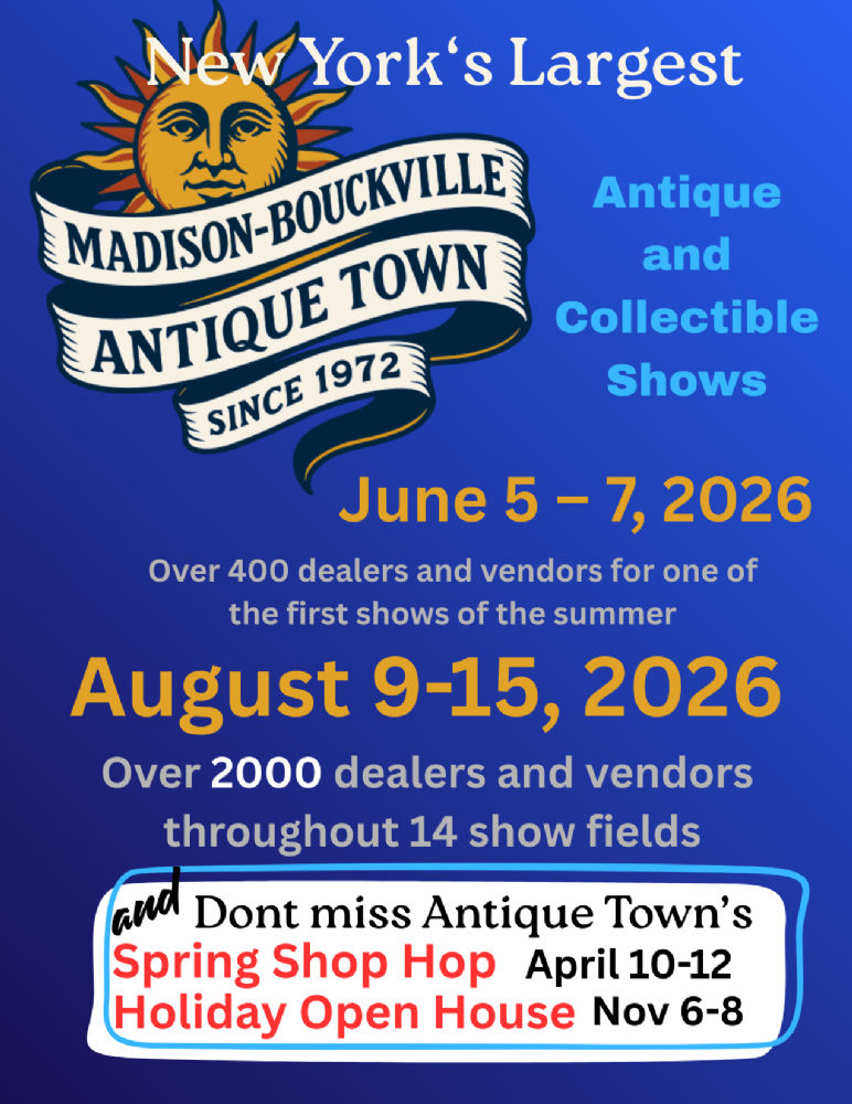 Location The Depot Antique Gallery 6768 State Route 20 Bouckville, NY 13310 Contact Name: Kara Croyle Phone: 3157062565 Web site: https://www.thedepotantiquegallery.com/events Shop all the Antique Shops along a 1 mile strip of Route 20 in Madison-Bouckville! Help welcome spring by treasure hunting for all your favorite antiques and collectibles before the Big SHOWS! 10 Shops all offering a unique antiqueing experience!