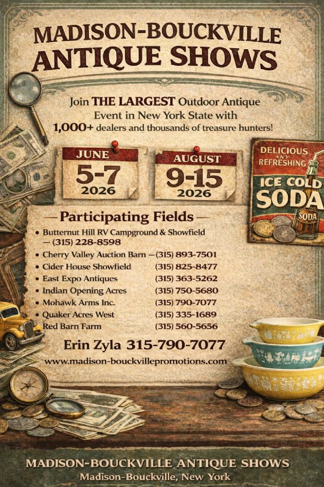 Website Madison-BouckvillePromotions.com Location Madison-Bouckville Antique Show 6819 St RT 20 Bouckville, NY 13402 Contact Name: Erin Zyla Phone: 315-790-7077 Web site: Madison-BouckvillePromotions.com Over 2,000 dealers and vendors Get Directions using Google Maps2FA82ADA-3995-4D20-9243-D475B702F7A8