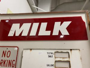 Plastic red sign with white lettering advertises "Milk". It would be great gift for a dairy farmer. Sign measures 113" by 44". Ther is a small chip missing out of upper right corner. Dealer 56 can be reached at mitricity@aol.com