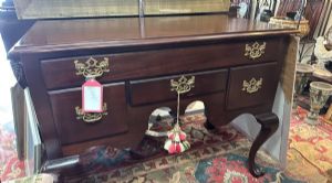 Queen Anne style lowboy with cabriole legs and brass hardware. Tassel sold seperately.