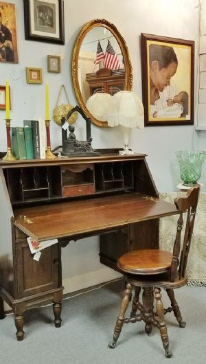This desk is in wonderful condition. It measures 42"H x 40"W x 15"D. It can be seen and purchased through Marietta Antique Mall - 1427 Roswell Road - Marietta, GA 30062. Ask for directions to Booth 1000 Fairground - Dealer #151 - Item #7247