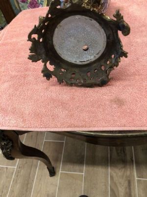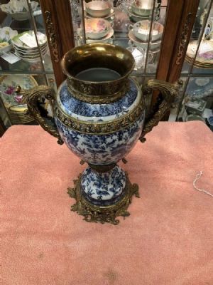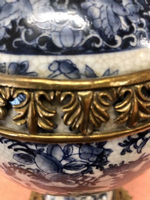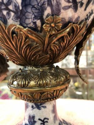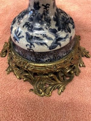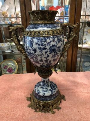 Chlinese export-style pedestal vase. Ormolu mounted double handled urn vase. Blue and white crackleware porcelain with floral and bird motif. Porcelain, Antique Brass. Width: 13". Depth: 8". Height: 19". Rococo Style, Chinese. Wear commensurate with age and use.