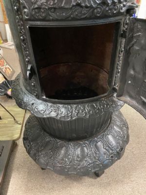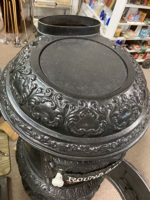 This round black stove has been repainted with advertising name"Round Oak". It is a clean, neat piece-measuring 22"wide and 42" tall.