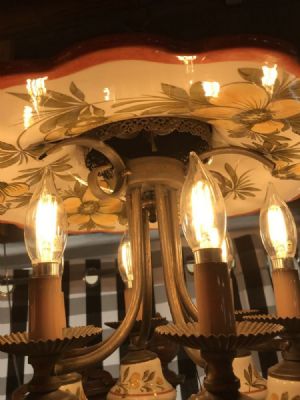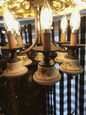 1930's vintage hand painted ceramic chandelier, great cottage or French look. Pierced hand stamped brass banding and brass finials. 6 lights, shown using 65 watt bulbs. Glass chimneys can be used with bulbs, shown here without. Muted colors of greens, rusts and oranges on cream background.