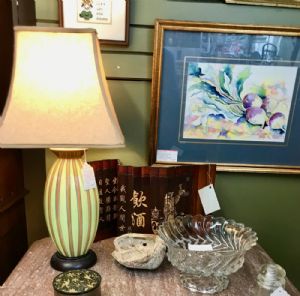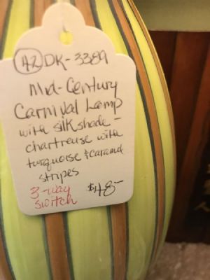 Mid Century Carnival Lamp with silk shade and 3-way switch. See a separate listing for the watercolor painting on the wall.