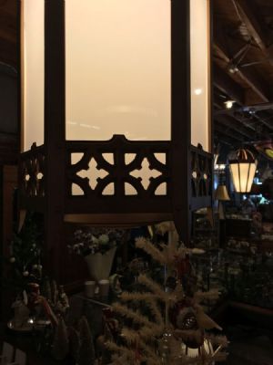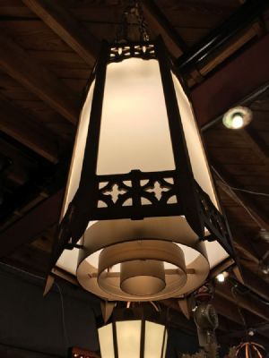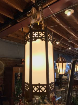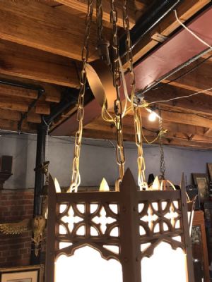 1930's-50's cream colored panel diffusers, brass framework. Uses 9 light bulbs. Approximately 27 1/2" in height and approximately 26" in diameter.
