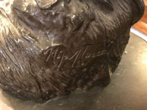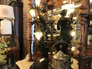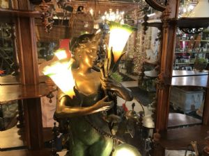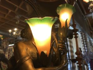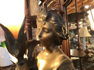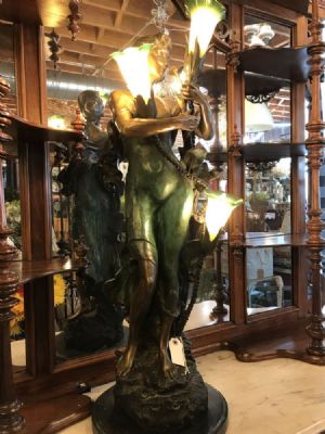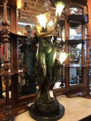 Signed Moreau, Late Edwardian 1930-1940s Bronze Lamp. "Flower Girl" Bronze Sculpture Lampafter. French Wax cast bronze accent lamp. Originally cast by Augusta Moreau. Sculpture is of a young girl enjoying flowers holding 3 iridescent "favrile-style" shades. Patinated Bronze and copper mounted on a green marble base. "AROME" (a nymph) is incised on front and by "A. Moreau" is incised on the side. Measures 34.5 " High and marble base is approximately 14" in diameter. There's a switch on cord. Use maximum 25 watt bulbs, requires 3.