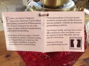 "Fenton Art Glass Company represents American handcrafed glass artisty. Located in Williamstown, WV, Fenton is known for its wide range of colors, delicate handpaingin, and expert handcrafting."
