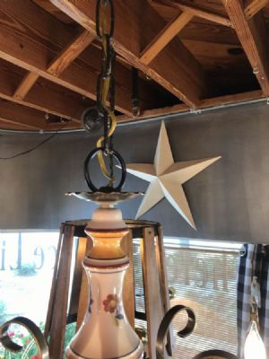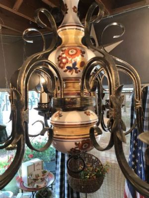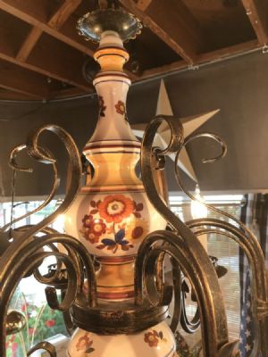 1940's vintage Hand painted on porcelain in tones of blues, rusts, mustard, golds, cranberry and orange on cream background. Antique brass finish on hand wrought arms and hand stamped brass banding. 6 arm lighting, shown using 65 LED bulbs. Can be used with clear glass chimneys on bulbs.
