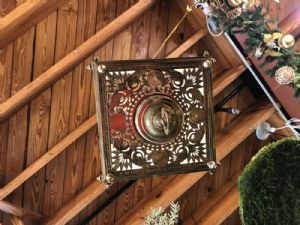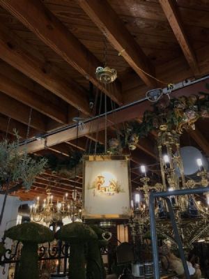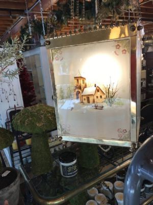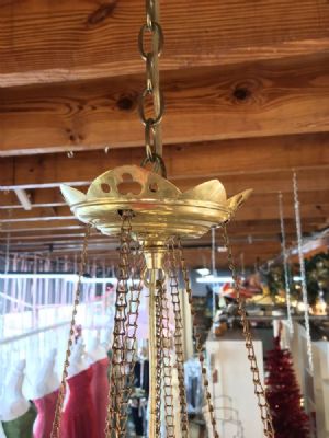 1915-1920's Hand painted glass panel chandelier. Stamped brass and chain. Uses one bulb, 65 watt or equivalent LED bulb. Please see all scenes of fixture.