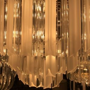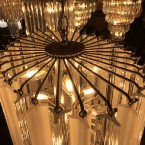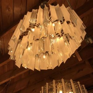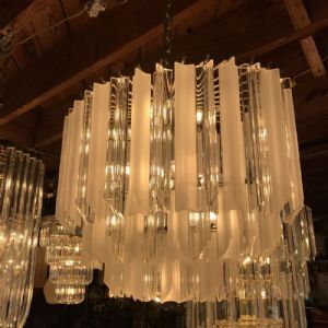Unbelievable true 1950's Mid Century Lucite Chandelier. Three tiers of clear and frosted lucite prisms. Beautiful oval design. Silver tone metal frame and light hangers. Same chain tone and adjustable length. 10 bulbs requiring 65 watt chandelier bulbs or equivalent LED's.