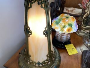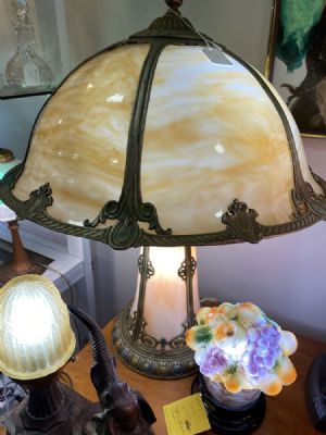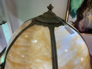 This Pittsburg lamp is 26" tall with 19" wide shade. Ornate iron work decorates the slag glass.