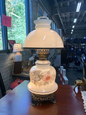 Beautiful vintage hurricane lamp. Cream in color with flowers and brass base. 3-way switch for top/bottom/both allows you to create just the right amount of light or look.