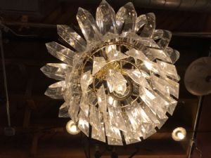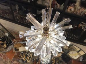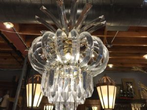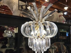Vintage 1950s Lucite Pineapple shaped Chandelier all lucite prisims with gold metal base and six foot chain. Requires 5 chandelier bulbs and is approx. 18 inches in Diameter and 20 inches in length.