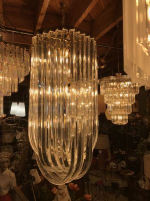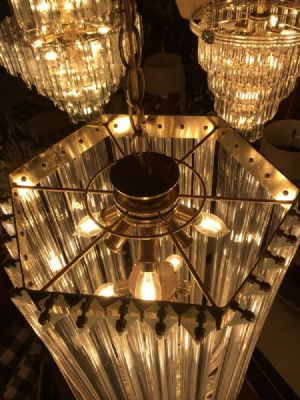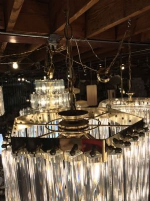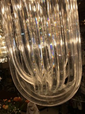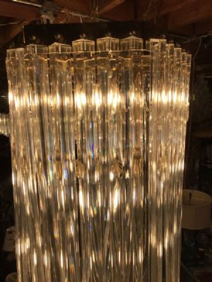 Stunning mid century waterfall lucite chandelier. Extra large in size and a show stopper in multiple spaces. Gold done metal frame and light arms. Uses 65 watt chandelier bulbs or LED equivalent. Adjustable chain length. chandelier height approximately 30", width approximately 14"