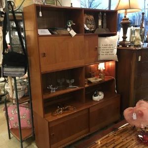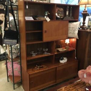 Beautiful Danish Modern wall unit-teak finish,adjustable shelves, sliding door storage. This piece has it all. True MCM Domino mobler design. Two pieces makes it easy for moving.