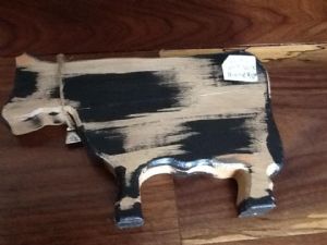This great standing wood cow is a must for any primitive collection. Complete with bell around the neck!