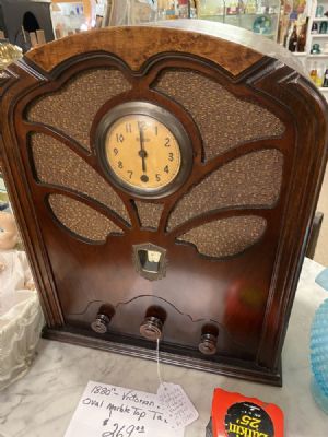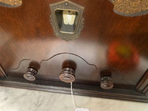 RADIO IS WORKING. IT MEASURES 15" BY 18 1/2". wOOD IS IN GOOD SHAPE.