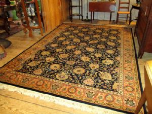 This machine made Room Size Oriental Rug is a beauty! Made of wool, the colors are wheat, salmon and a soft blue on a lovely navy background. There is fringe on each end, and it is all in tact. The rug has been cleaned, so the colors are brilliant and the fabric is fresh. It has no stains or odors and no moth infestations. A rug can put a finishing touch on any room, and this would be a fitting choice for your home. Contact BARN ON 26 today to secure this rug.