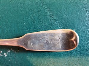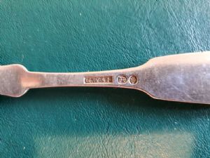 Fine estate condition, 5.40 ozt., 6" length. Old script monogram, " Deuel".