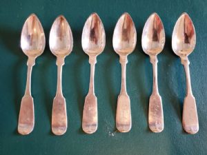 Fine set of 6 American Antique coin silver dessert spoons bearing hallmark of Gale, Hughes & Wood, New York. Ca 1840.