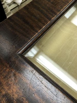 English Chinese Chippendale Display Table with Beveled Glass Top. Lined in celadon green faille taffeta (note stain on one side).