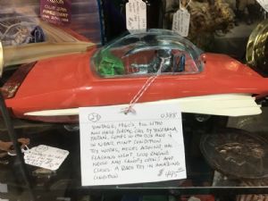 Vintage 1960's tin litho and hard plastic car. Comes with Box and is in near mint condition. Works, moves around with a flashing light, engine noise. Canopy opens. A rare toy in amazing condition.