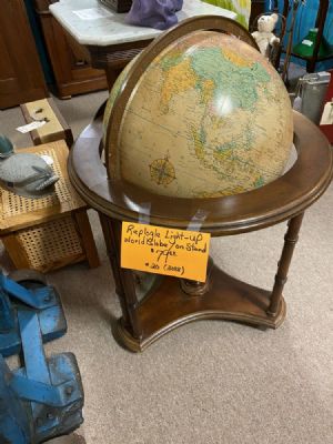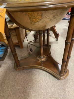 This globe lights up and stands securely while you look at different areas. Wood stand is in good shape. Height is 32" while width is 22".